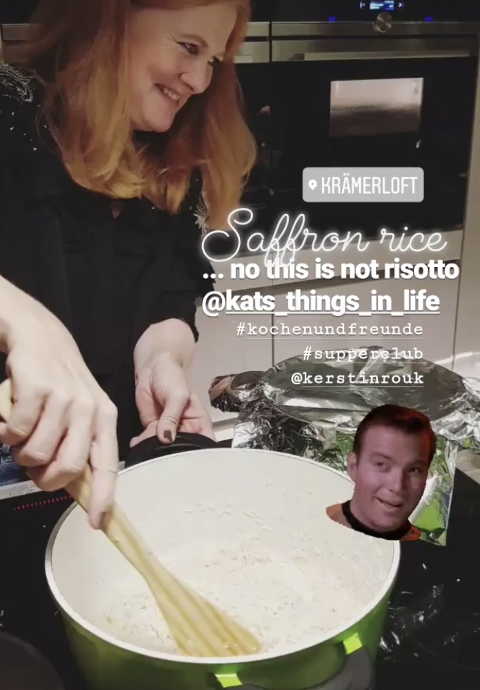 Nach einer kleinen Einleitung für alle, es ist auch wirklich interessant, dass es sogar zwei Gäste gibt, die hier ihr jährliches Freundinnentreffen mit uns zusammen verbringen, sagen Meeta und Kerstin tatsächlich, wir müssen uns in Gruppen aufteilen, um die verschiedenen Menüpunkte vorzubereiten. I dont Like normalerweise this. 🙃 Aber: alle fremden Leute sind wirklich sehr offen und es findet sich schnell. Micha und ich bleiben gleich beim uns am nähesten (also wegmäßig) liegenden Speisepunkt hängen – der Safranreis! Das erscheint uns für zwei eine recht machbare einfache Aufgabe. Später wird uns bewusst, wir haben dennoch auch ganz schön Verantwortung. Es sollte auf keinen Fall anbacken und es soll auch kein Risotto werden 😂😁.