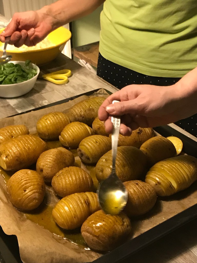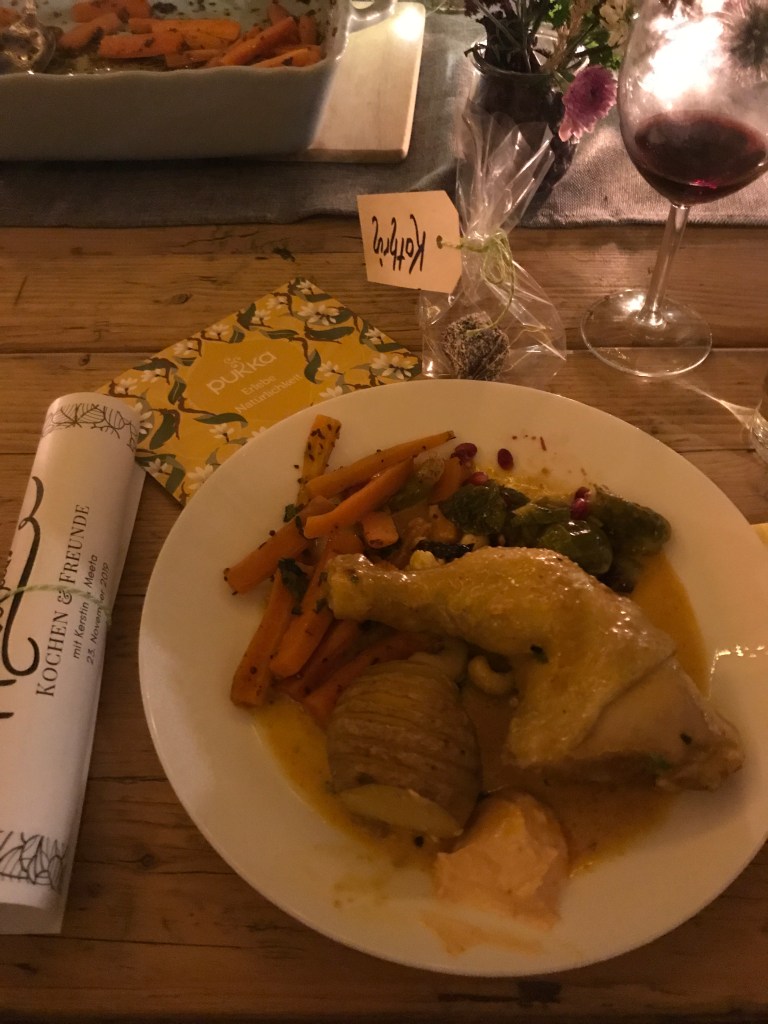 Da es so entspannt und unkompliziert am Küchenblock und Herd zugeht, gelingt jede Speise hervorragend. Meeta und Kerstin flechten in unsere Gespräche immer mal Anekdoten aus den ersten ihrer Supperclubs ein, was so alles Zuviel oder zuwenig war. Das könnte vielleicht auch ein Markenzeichen werden…“Kochen mit Freunden – immer lieber ein bisschen mehr“. Diesmal war mehr: die Vorspeise ‚sardinische Gnocchi’. Locker 10 Leute oder mehr hätten wir noch verköstigen können. Sie war im übrigen äußerst schmackhaft. Weiterhin gab es Hähnchen, gebackene Kartoffeln, tolles Rosenkohlgemüse mit Granatapfelkernen, vegetarisches Gemüsecurry und natürlich Safranreis – nicht angebacken und so wie er sein soll. Das indische Dessert nach dem Rezept von Meetas Oma war ein Gedicht. 👌