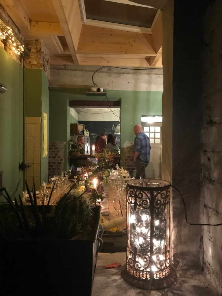 Schon das Tür-öffnen vom Krämerloft ist eine kleine Überraschung. Sie öffnet sich wie von Geisterhand, und als der ‚Geist‘ sich outet, kennen wir ihn doch, über zwei Ecken 😉. Sehr gut denke ich, da ich ja zumindest die Gastgeberinnen kenne, hat Micha nun auch schon jemanden, um sich ein bisschen bekannt zu fühlen. Als wir zum vorbereiteten Essenstisch kommen, komme ich aus dem innerlichen Staunen nicht mehr heraus.