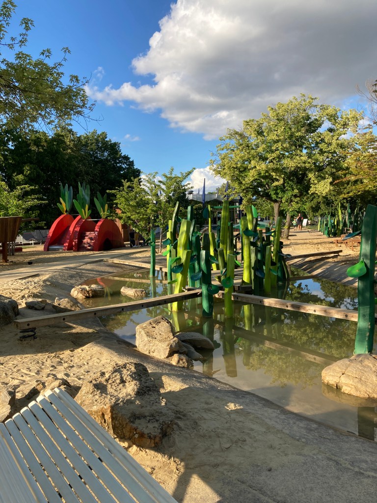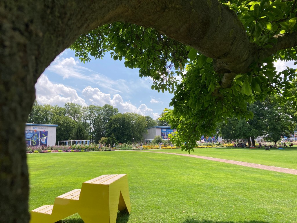 Eine Augenweide ist von jeher das sogenannte Große Beet, welches mit Schwunghaftigkeit und der saisonalen Pflanzenschau besticht, von oben sieht es aus wie ein wunderschönes Gemälde. Geht man über die Große Wiese, kann man sich schattig oder sonnig ein Fleckchen zum chillen aussuchen, Sitzgelegenheiten mit oder ohne Lehne, tief, normal oder schaukelnd gibt es genügend und der Blick durchs Blätterdach ist zum träumen schön.