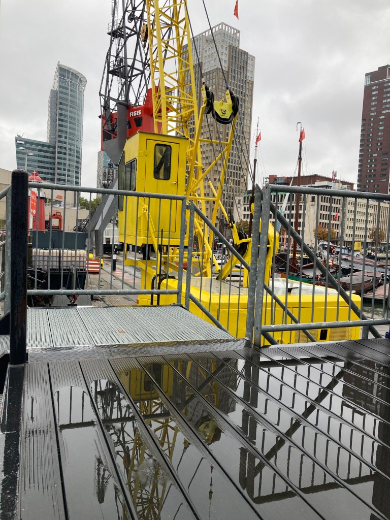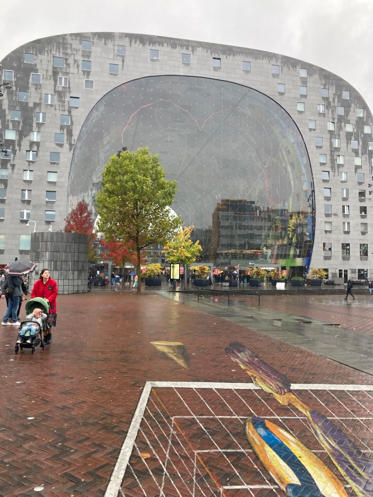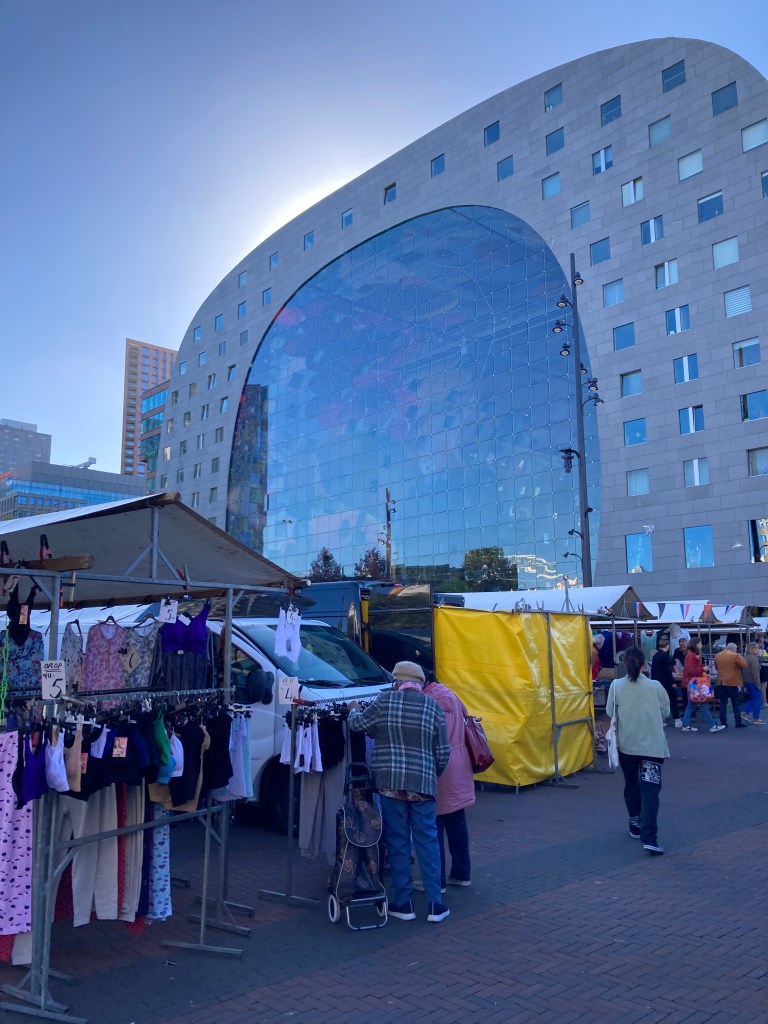 Da das Hotel direkt an der Erasmusbrücke liegt, nebenan Straßenbahn, Metro, Wassertaxi und selbstverständlich – wir sind ja in einem fahrradfreundlichen Land – hoteleigene Fahrräder, haben wir alle Möglichkeiten, gemütlich überall hinzukommen. Bei unserem ersten Ausflug merken wir, dass tatsächlich auch zu Fuß alles gut erreichbar ist. Alles ist: die Markthalle, die Kubushäuser, die gelbe Luchtsingel Brücke, die Fenix Food Factory, wie oben schon genannt die Erasmusbrücke und die vertikalen Wolkenkratzer von Rotterdams Stararchitekt Koolhaas.