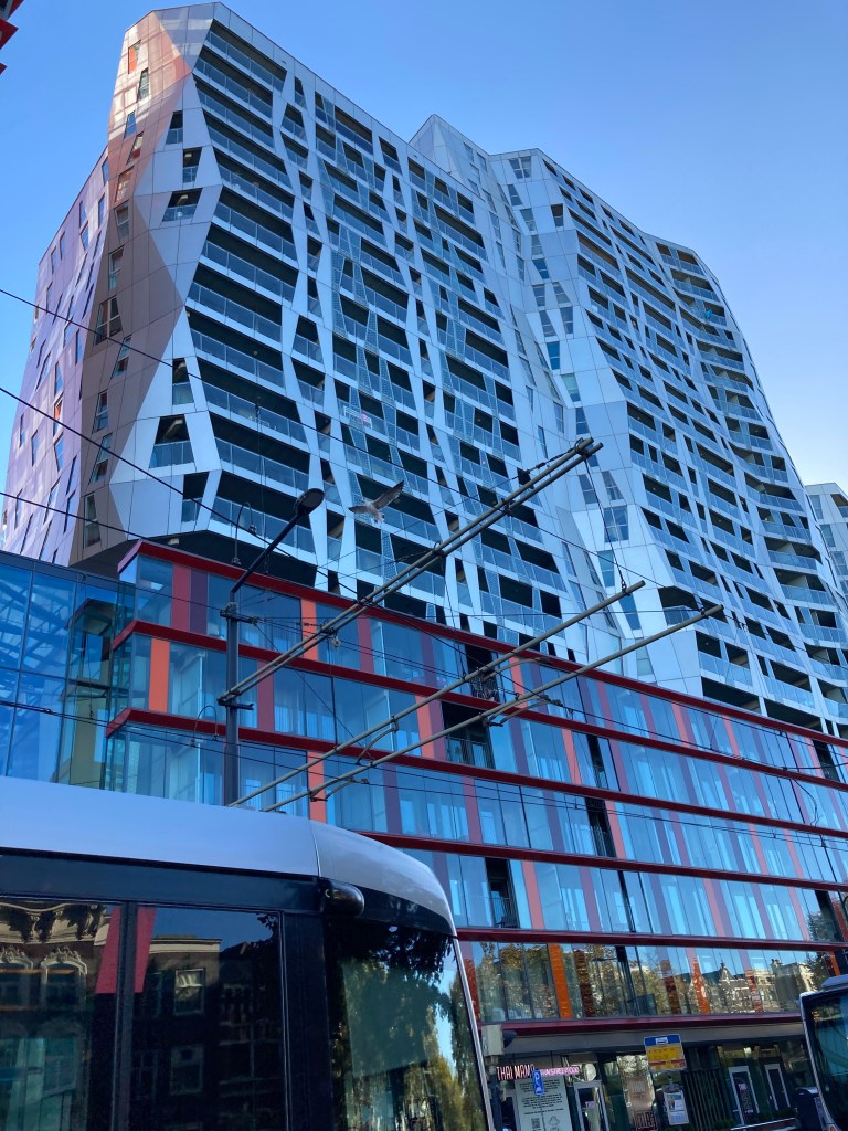 Moderne Architektur ist das Stichwort, wenn man diese Stadt beschreiben will. Sie wirkt auf uns wie eine Spielwiese der Architekten. Kreativität kennt anscheinend auch beim Häuserbauen keine Grenzen. Es ist wirklich spannend zu sehen, was alles möglich ist. Das die Stadt so aussieht wie sie aussieht, ist freilich aus dem unschönen Kapitel 2.Weltkrieg entstanden. Rotterdam war eine der am schwersten von Bombenangriffen betroffenen holländischen Städte. Die Innenstadt war außer wenigen Ausnahmen komplett zerstört, genauso wie der Hafen und so wurde die City von den Stadtplanern quasi neu gezeichnet. Heute ist der Seehafen Rotterdam der größte der Welt und die vor allem in den 80er entstandenen Wolkenkratzer Viertel maßgeblich für die Attraktivität der Stadtsilhouette verantwortlich. Rotterdam ist vor allem eine Arbeits – und Feierstadt. Bürogebäude jede Menge, das ist unübersehbar. Wie wir bei unserer längeren Straßenbahn Tour feststellen, kann man aber außerhalb der Innenstadt auch in sehr schönen kleinstädtisch gehaltenen Vierteln wohnen. Es gibt viel Grün – interessant auch die größte Dachfarm Europas -, viele Wasserwege, viel Kunst an und auf Straßen und wirklich hervorragend organisierte Radwege.