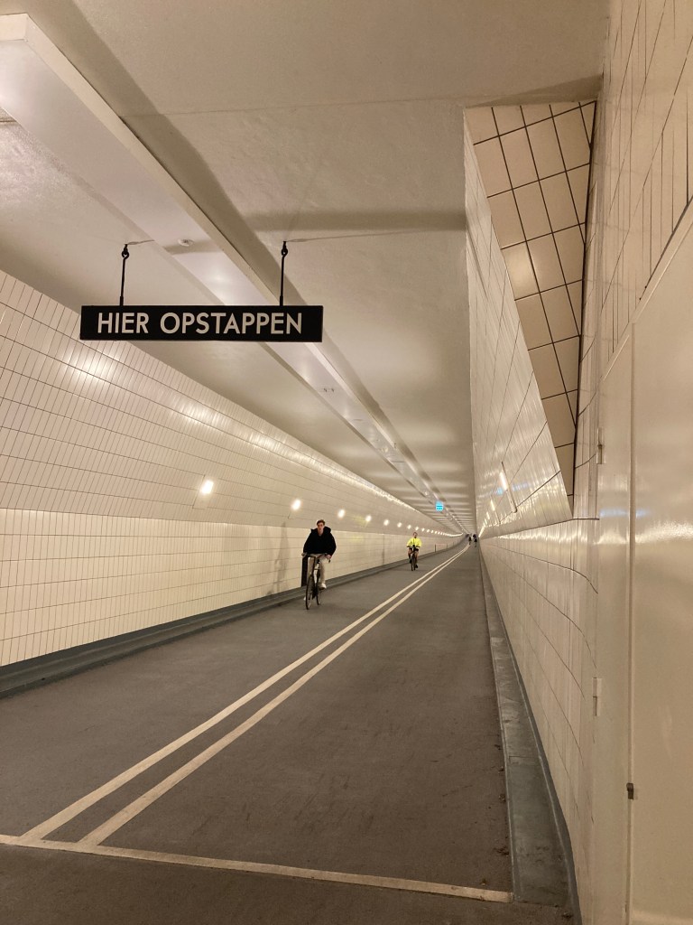 „Willst du eine Großstadt mit dem Fahrrad erkunden, so lauf erstmal einen Tag.“ So würde nach diesem Städtetrip mein Rat zum Rad lauten. Wir bekommen beim Laufen einen groben Überblick der Richtungen und Entfernungen, studieren das Wie der Radwege und ich vor allem das Tempo der Radfahrer. Die Stadt ist zwar geschäftig und die Fahrradwege auch voll mit Radfahrern(so wie man das hier auch erwartet), aber ich hatte nicht das Gefühl dass es überhektisch ist. Man kann gemütlich fahren wenn man will, auch mal rumgucken und anhalten. Toll ist, dass jede Kreuzung für jede Verkehrsteilnehmerart – mit Fahrrad/ ohne Fahrrad/ Auto – ihre eigene Ampel hat. Und alle machen mit. In Paris vor vielen Jahren hatte ich den Eindruck, es gibt zwar Ampeln, aber es interessiert keinen. 🙈 Am interessantesten bei unserer Fahrradtour war der Maaßtunnel. Man fährt in eine Art Bahnhofsstation, dann mit Rolltreppe oder wahlweise Aufzug etliches an Metern nach unten, schwups ist man in der Fahrradfahrerröhre. Einen knappen Kilometer den Fluss unterqueren und dann wieder mit Rolltreppe nach oben. Fetzt!